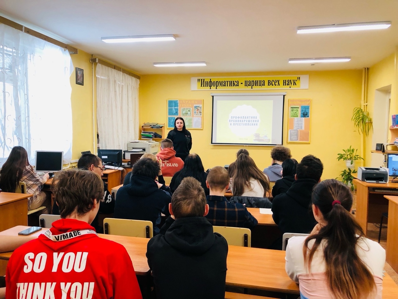 Инспектор ПДН провела профилактические беседы в 7-9 классах МОУ ВМР «СОШ №47 р.п. Сенной» Вольского района на тему «Подросток и преступление». Учащимся рассказали об ответственности за совершение имущественных преступлений и ответили на все интересующие вопросы.